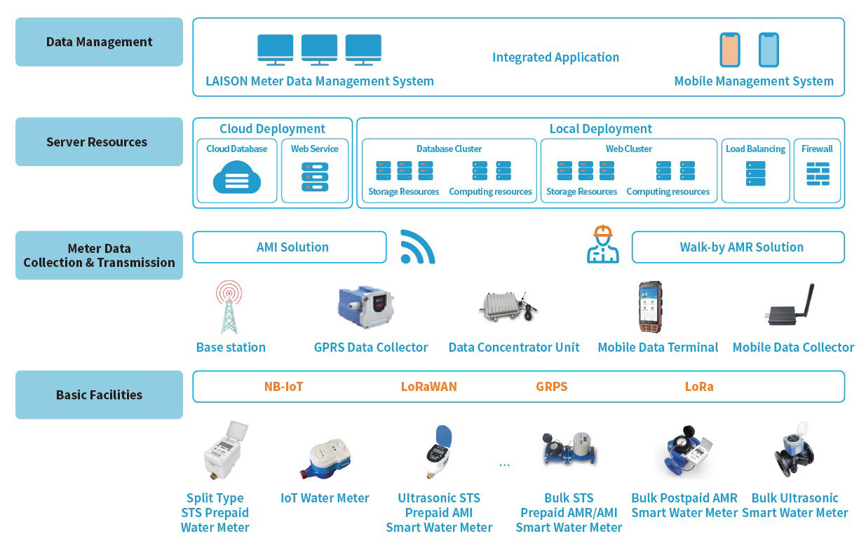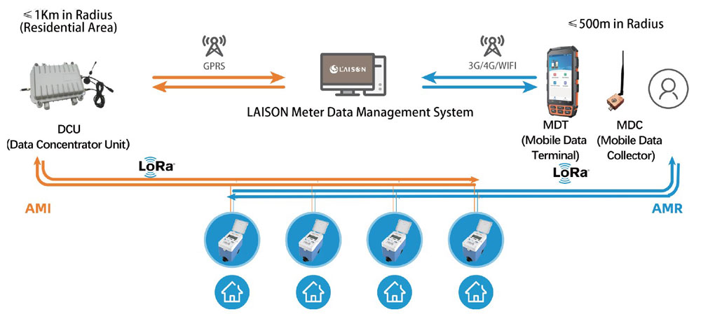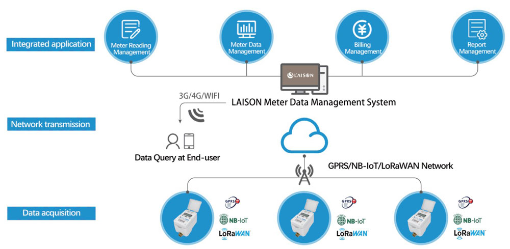 By deploying the AMI system, the remote meter data, including Hourly/Monthly Consumption Data, Meter Battery Voltage, Run Status, etc. can be automatically uploaded to LAISON MDM System through GPRS/NBIoT network.
